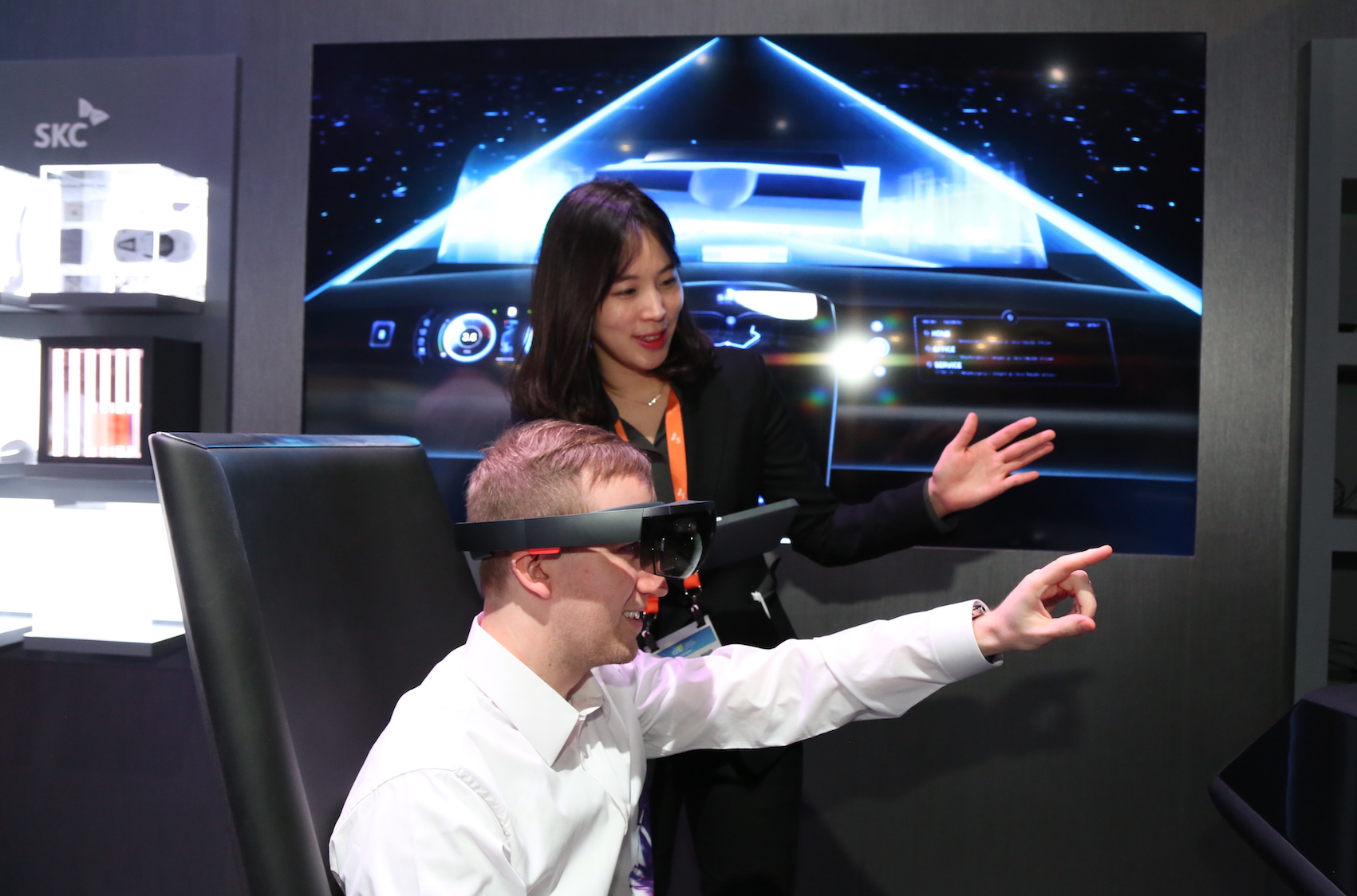 [7일 미국 라스베이거스에서 개막한 세계 최대 가전쇼 'CES 2020'에서 SKC 구성원이 홀로렌즈 체험방법을 설명하는 모습]