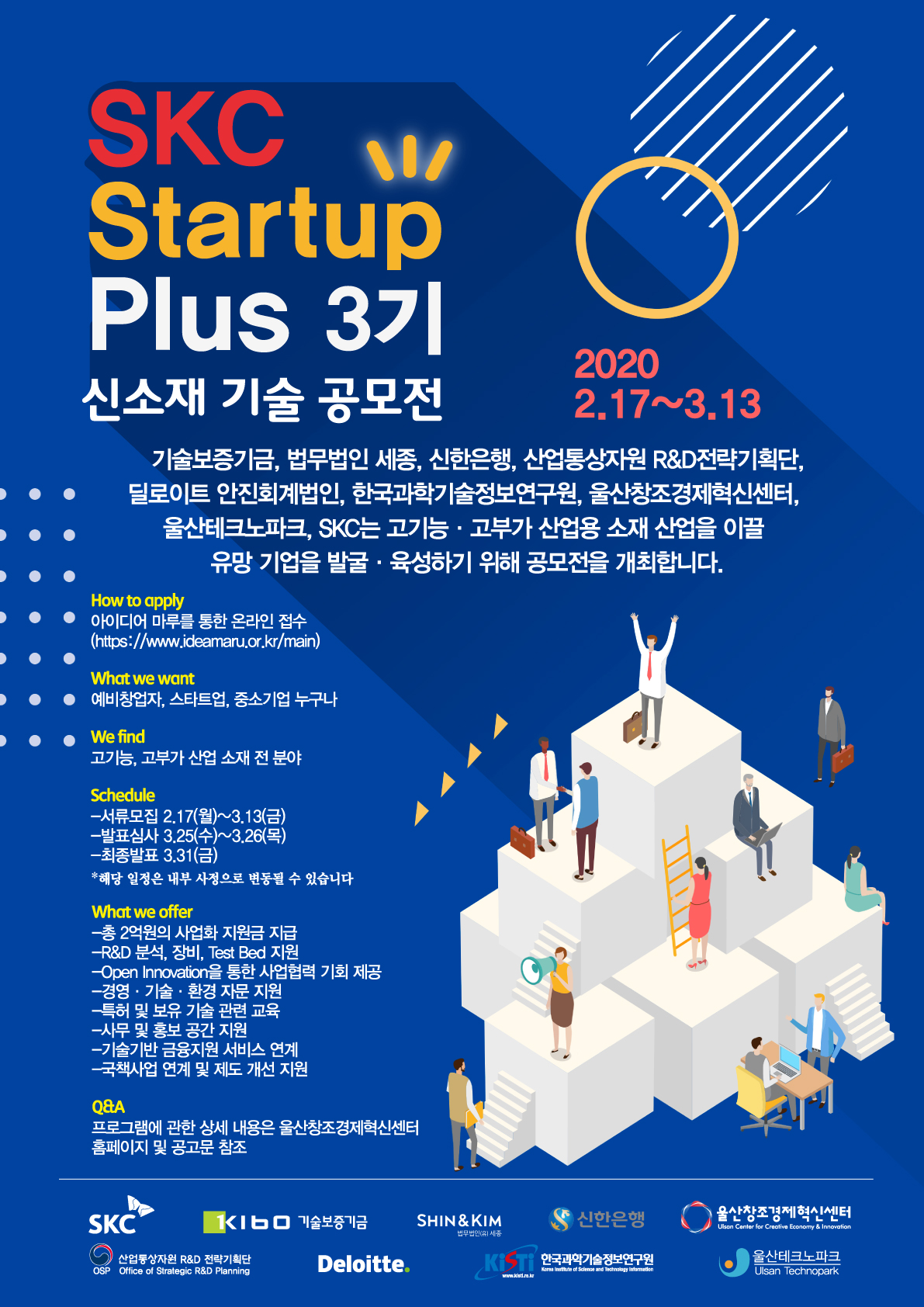 SKC는 17일부터 ‘SKC 스타트업 플러스’ 3기 참여기업을 모집한다. 모빌리티, 친환경, 에너지 절약 등 고기능/고부가 산업소재에 대한 창의적인 아이디어나 기술을 가진 예비창업자, 스타트업, 중소기업이 대상이다. 3월 13일까지 ‘아이디어마루’(http://www.ideamaru.or.kr)에서 신청받는다.