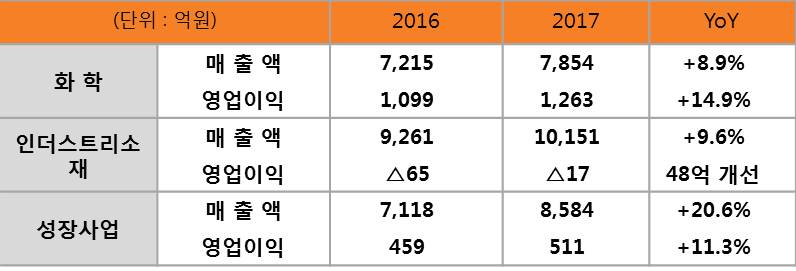 부문별로 살펴보면, 화학사업부문은 매출 7,854억원, 영업이익 1,263억원을 기록했다. 원가 상승, 경쟁 심화라는 악조건 속에서도 고부가 PG 등 판매량 확대, 원가 절감 추진, 지역별 가격 변동에 선제적 대응 노력을 더해 2016년보다 좋은 실적을 거둘 수 있었다. 매출은 8.9%, 영업이익은 14.9% 증가했다.