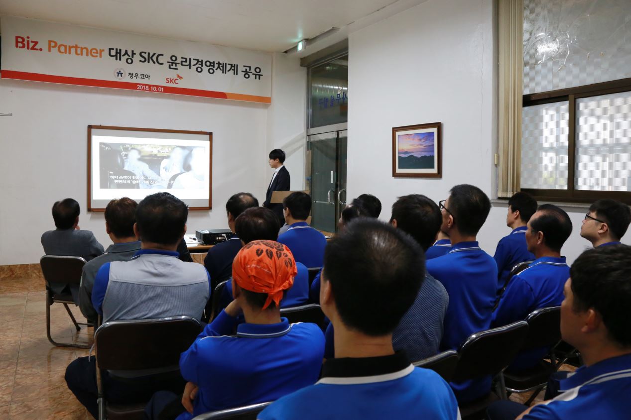 SKC는 1일 경기도 평택시에 있는 청우코아 본사를 방문해 윤리경영 교육을 진행했다. 1988년 SKC 협력업체가 된 청우코아는 현재 SKC에 필름을 말 때 쓰이는 종이관을 공급하고 있다.