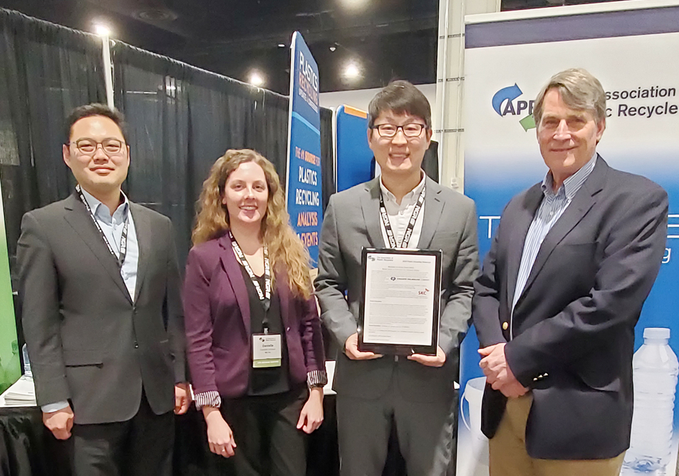 [SKC 에코라벨을 적용한 제품이 미국 재활용업체협회로부터 우수성을 인정받았다. 사진은 SKC 구성원과 존 스탠디시 APR 기술위원(가장 오른쪽)]