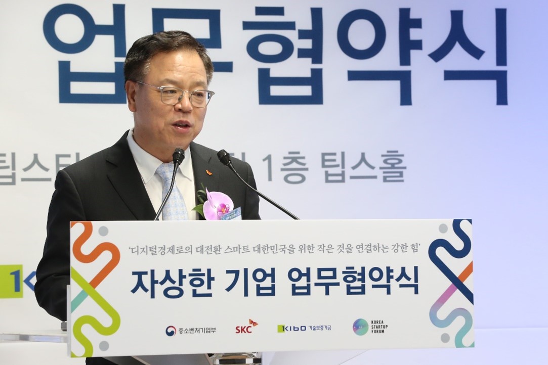지난 해 SKC 이완재 대표가 SKC 자상한 기업 업무협약식에 참석해 연설하고 있다.