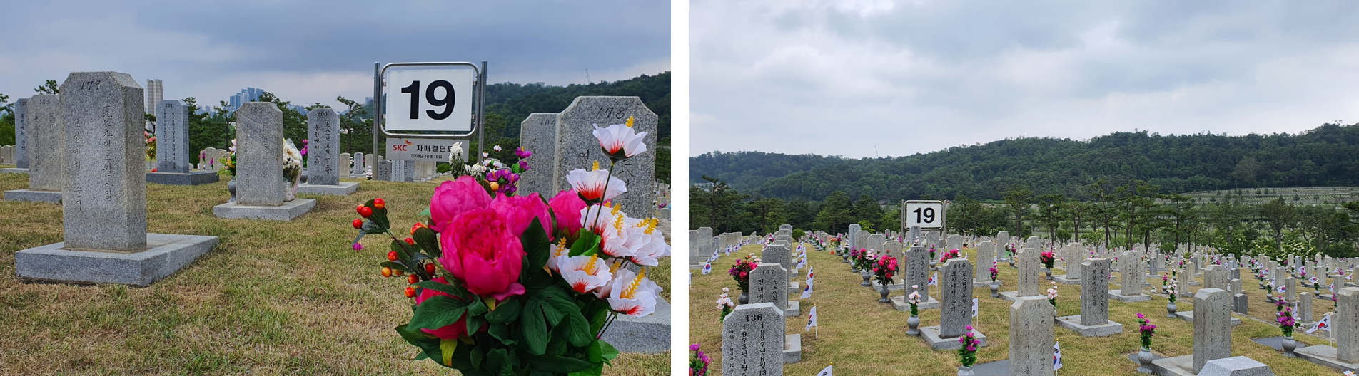 SKC와 서울 현충원이 자매결연을 맺은 19묘역에 헌화가 되어 있다.